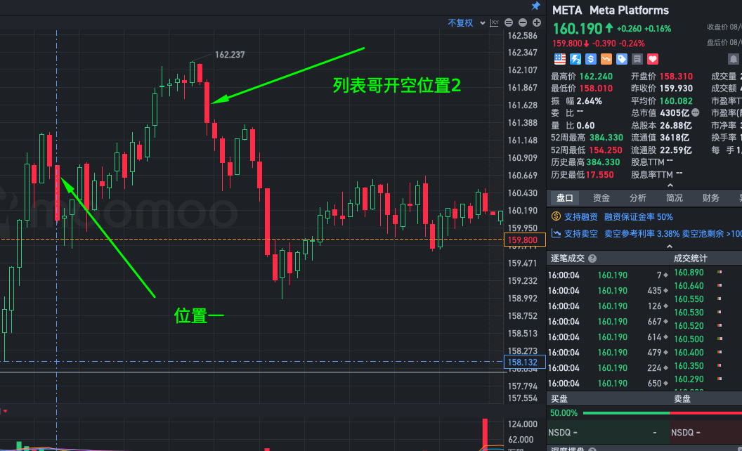 今天美股的走势也是笼罩在佩洛西访问台湾的新闻上,多空双方交替发力,前半段军工股在不断上推,火药味十足,自佩洛西航班落地台湾开始,台股也开始上涨,冲高了一波后再回落。列表哥也是在不稳定中寻找机会,第二波顺利收复META