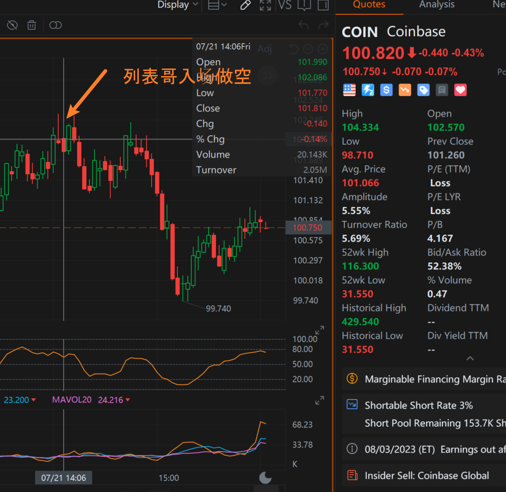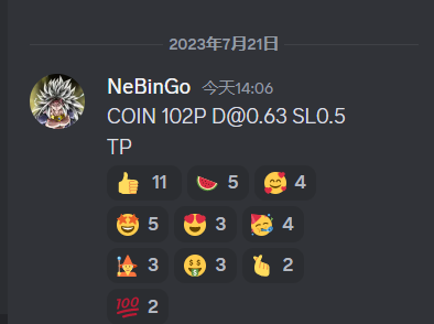 COIN 由 0.63 到 2.21,肉的厚度是250% ,肥美的周末,也看到有部分群友持着下周的,我是没有留,先吃下肚子,分析清楚再下一步,记住心态第一,每一笔交易都要给你自己一个恰当的理由。