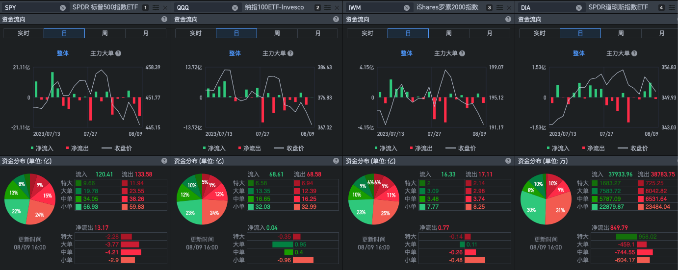 资金流的行为习惯依然没有改变,继续是追随小幅度流入,大幅度流出的负值趋势,可以很清晰看到今天的SPY全线流出,流量明显。