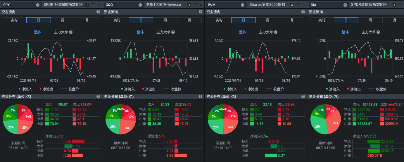 资金流来看SPY和IWM,DIA都是流入,其中DIA刚刚来了个大大的回头,所以支撑者信心还是继续的,第一波下跌想着捡到好货色的心态,QQQ资金全面流出,量接近上周末。