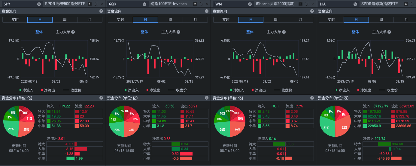 大盘资金流持续流出,SPY流出量最大,可以看到最近20日里面主要都是快速流出,轻微流入的节奏,依然没有改变。