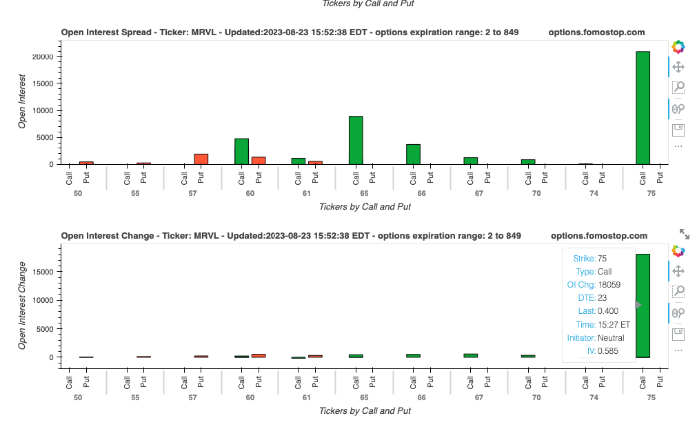 接着回看这两天的作业,列表哥都是在尾盘出手的中期刀,昨天的今天开奖成功,今天的暂时来看由于NVDA的暴力拉升,也很收益,大概率开盘也是个肉区的娃,要不要抱娃回家就看大家了。同时我也注意到了MRVL的在FLowmaster也出现了对应的CALL位增量,虽然不是同一个Strike,但起码也能够成为大家参与的支持。