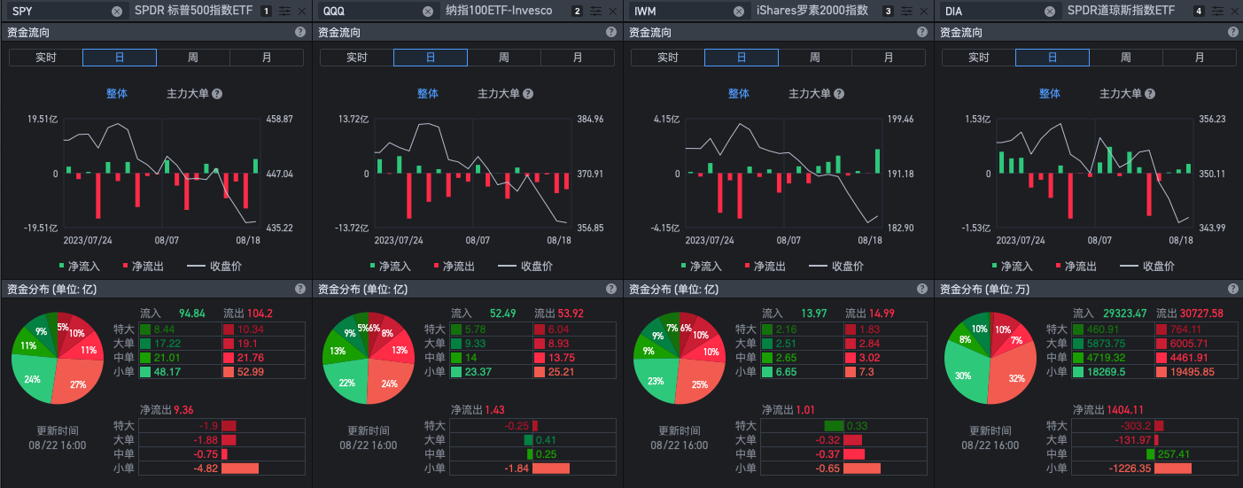 尽管大盘四大指数今天全线收红,但是注意到了其中三个的资金流都是流入的,一点不悲观,IWM的流入量还呈现递增的趋势。