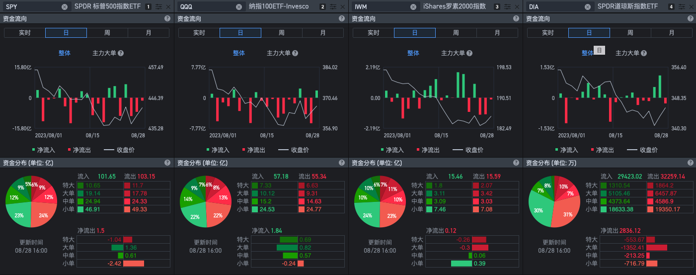 可以看到今天的量偏小,QQQ轻微的流入,其余都是轻微的流出,毫无特点的资金流平流。