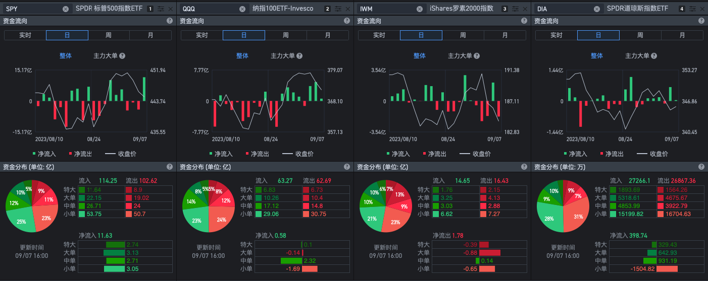 SPY流入十分明显,小盘股资金转移的感觉,偏向多方的资金流表现。