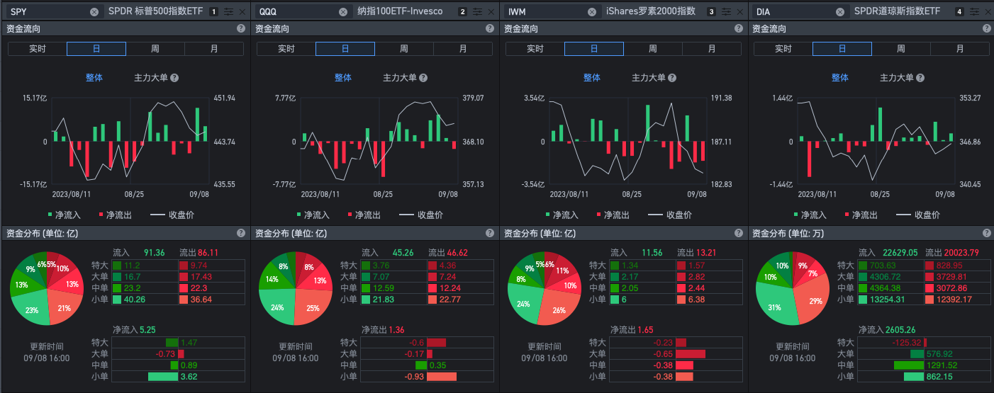 周五SPY,DIA在流入,QQQ,IWM在流出,这综合起来其实没什么偏向,硬要说个偏向的话,记得我说过IWM流出其实偏向多方的,资金轮动嘛,小盘支撑大盘。