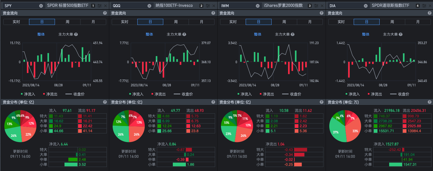 除了IWM,大盘持续流入资金,资金流利于多方。