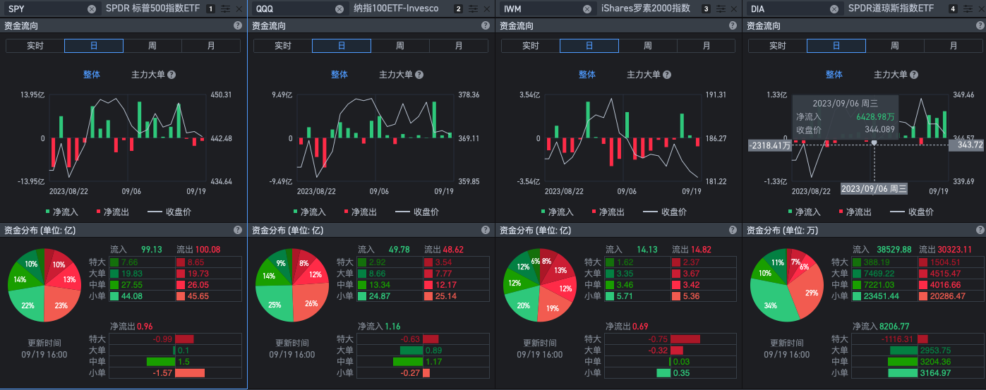 只有DIA比较明显地出现资金的流入,其余大盘的流量很小,总体来看这是个大家都很谨慎偏向防守的资金流阵势。