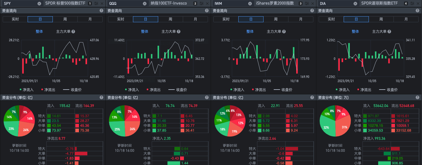 IWM资金流大量流出,SPY也同样受挫,QQQ和DIA减量流入