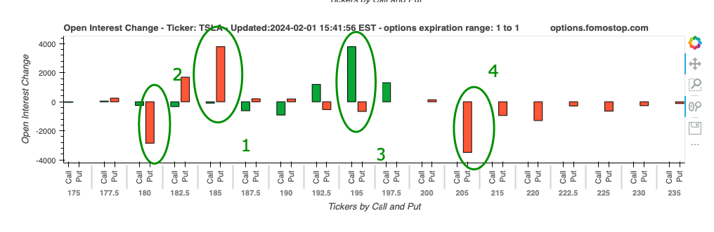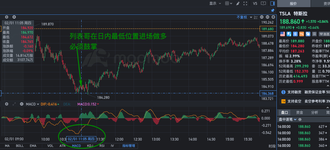 再来结合一下我的期权增量变化图看看怎么开好这车,股价日内低点是184.28,可以说已经到达了185的那个增量PUT的位置,所以庄家可以套利离场,在往远一点的180PUT也出现了减仓情况,也就是说套利盘不应该再继续做空特斯拉。另一方面,也留意到了195的增量call,配合着205的put减仓,所以195的拉力是不是很明显存在着了,这就为如何开好这车提供了依据。