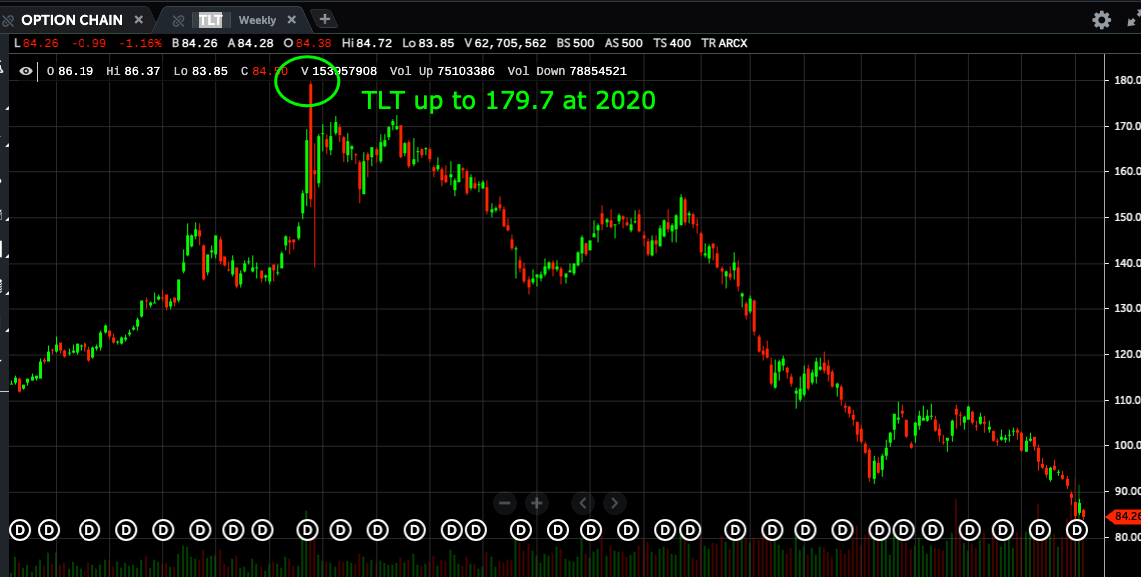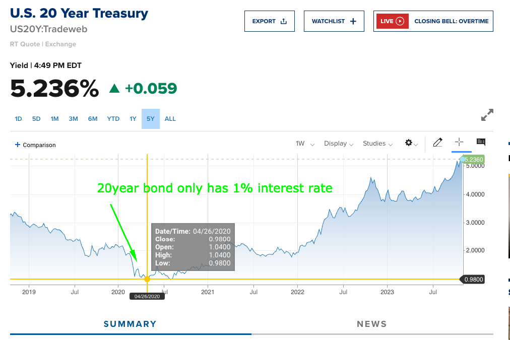 Around March 2020, the interest rate on 20-year U.S. bonds was just below 1%. At that time, the TLT ETF reached an all-time high. This happened because, in the context of the moment, the new bonds (1%) were perceived as having little value, while the old bonds were appreciating significantly."