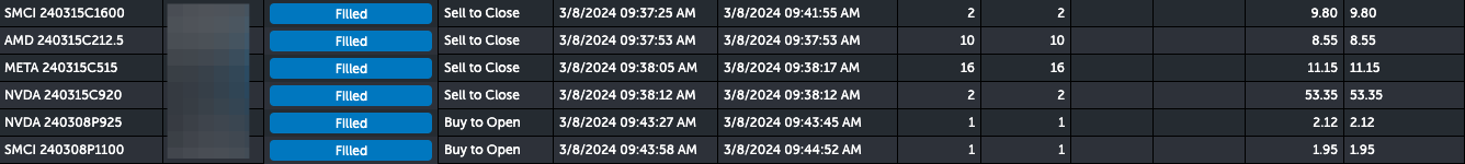 由我的交易记录可以看到我是在开盘就不断出手我的多头仓位的,哪怕卖飞了不少,但是我并没有继续追高回去,因为作为FOMOSTOP的一员,要追高也只会追在开端,绝不是大家都FOMO的时候去追。其次我在慢慢建立空头仓位,可以看到那时候SMCI 1100的PUT才1.95刀,NVDA925的PUT也只有2.12刀,实在是当天的好价,要知道大跌后能够翻十几倍呢,这些操作给当天开好了头。