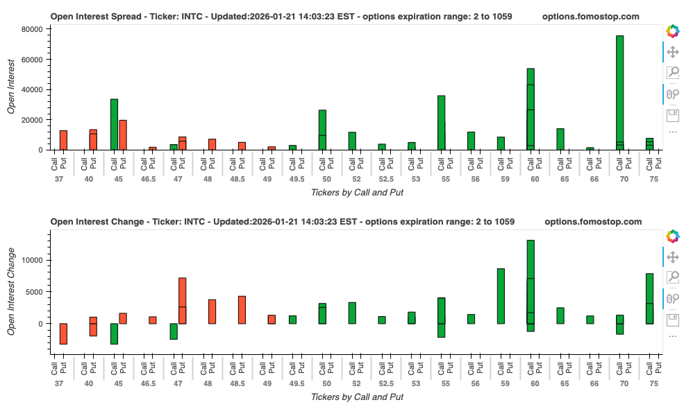 55这个位置摸摸就破但是明天是INTC的财报,情绪面目前是极度乐观,反而应该谨慎,数据很明显偏向多头,47的put也存在,位置就是突破前的支撑CC感觉可以做,放远些, 因为18A的经验还未真正得到普遍大众的关注,当然财报可以继续出新消息顶一下压力位置。
