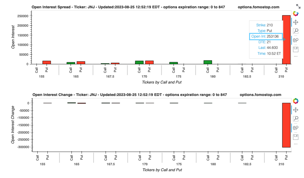 Stage One: Upon discovering that FLowmaster data was showing a significant bias towards bearish straddle positions, I began researching and decided to buy bearish positions. (On that day, JNJ was around $172. I purchased the 165 Put option with an expiration date of September 8, taking into account FLowmaster's positions as their DTE was 28.)