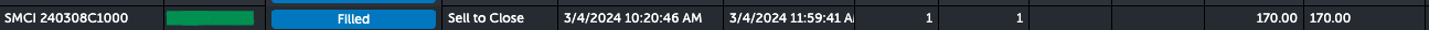 可以看到,当天期权收盘在106.1美元,最高价171.7美元,我的卖出价是170,交易记录如下: