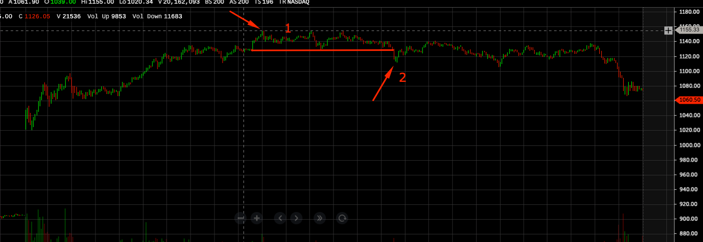结合上面的三张图片分析,期权的最大增量是1000Call,第二高的是1100Call,这两个位置都在日内超过了,超过后期权的拉力就会锐减,随后虽然还有1600Call,但是量越来越小,再配合技术面可以看到自第一张出货点(出货点位1)完成后形成了一个水平的压力位置一直无法突破,到了出货点2的时候呈现了反向突破的行为,所以在期权和价格行为都认为会回头的时候,我选择了全部离场。而尾盘股价急速回落到了1074.34美元,我也有考虑过做空,但是毕竟很强势的一只股票,PUT的量也比不上Call,所以就安心地看着它掉下去吧,该玩玩该吃吃。