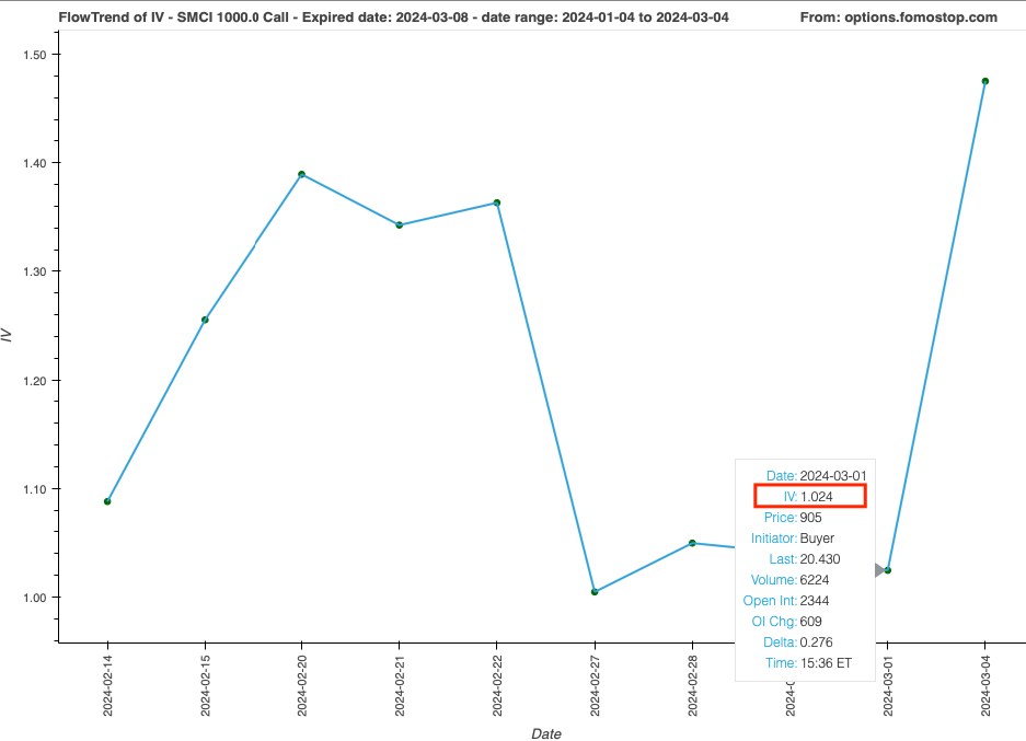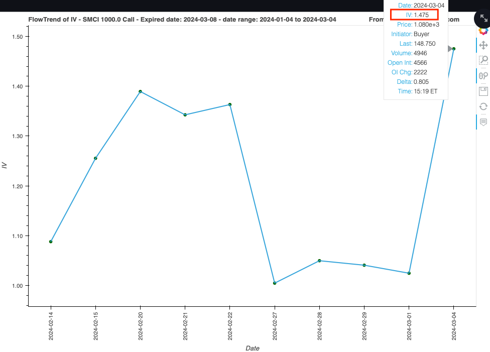 当天盘后,SMCI得到确认会加入标普500指数,是一个绝对的利好,盘后股价直接上涨100+美金,可以通过计算得知,如果IV等其它参数不变,当前位置利润大约为1万8千美元。当然,这个标志性的消息必然导致IV上涨,所以预期周一开盘的收益会更多。先通过FLowMaster看看前后IV的对比。
