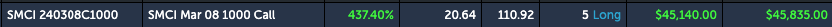 周一(2024年3月4日),在开盘前我已经制定了当天的大概计划,我可以首先肯定一点,开盘必然会出现有人急于套利的情况,预期会有小幅度下跌,而这个位置也会是追高进场的最佳位置,因为传统意义上的Sell the news,这个利好消息带来的涨幅,有些人会害怕股价掉回去,所以急于套利,我当然也是有开盘加仓的计划的,但是我的券商恰恰开盘时间出现了技术问题,导致我根本操作不了,所以我就没加成。其次由于IV的激增,并没有我周五进场的时间划算了。开盘首次看到的利润水平如下图所示: