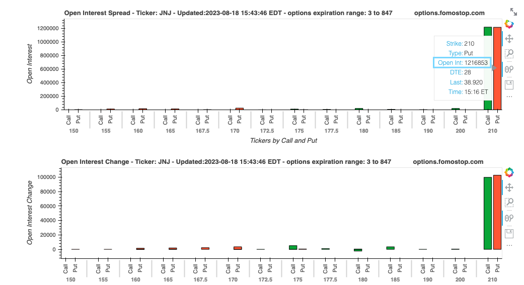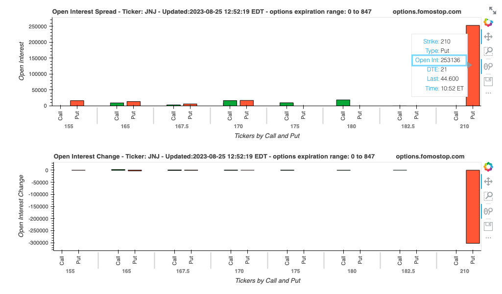 阶段一:发现FLowmaster数据进行了大量偏向空方的straddle开始进行研究,然后决定买入看跌仓位:(当天JNJ在172附近,我买入的是165Put, 到期日期9月8日,也是参考了FLowmaster的仓位,因为他们的DTE是28)